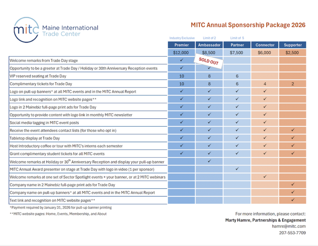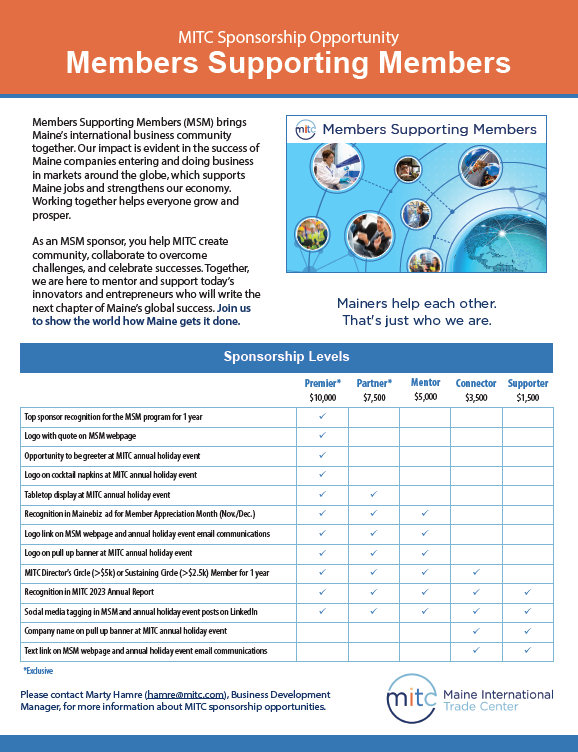 With a one-time sponsorship, you receive a full package of year-round benefits. From our signature Trade Day event to our Sector Spotlight series, MITC sponsors gain unique visibility and make personal connections with a targeted community of internationally active Maine businesses, academic institutions, and organizations.