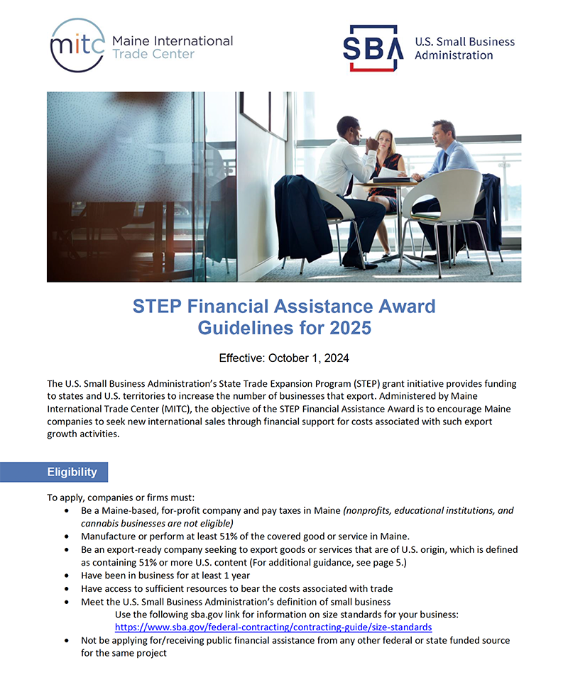 NOTICE: The U.S. Small Business Administration (SBA) funded State Trade Expansion Program (STEP) depends on availability, approval, and disbursement of federal funds. Thus, all company award reimbursements are contingent upon Maine International Trade Center receiving requested funds from SBA. MITC is unable to provide company reimbursements if we do not receive the federal funds.