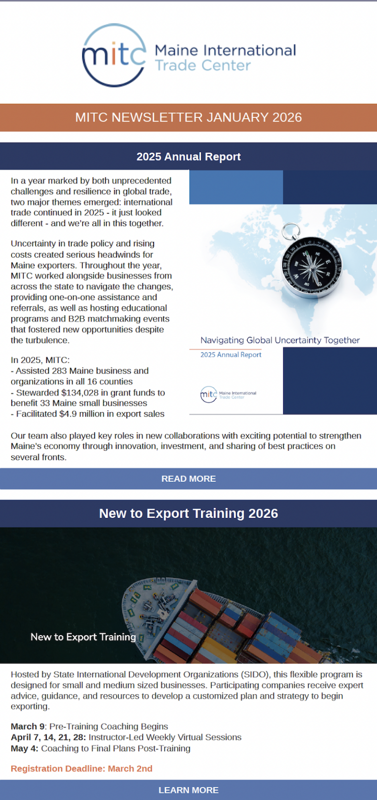 Newsletter Newsletter Maine International Trade Center distributes a monthly newsletter via email. Join Our Email List to receive the newsletter in your inbox, or use the links below to view PDF versions of recent issues. JANUARY 2026 NOVEMBER 2025 OCTOBER 2025 SEPTEMBER 2025 AUGUST 2025 JULY 2025 JUNE 2025 MAY 2025 APRIL 2025 MARCH 2025 FEBRUARY 2025 JANUARY 2025