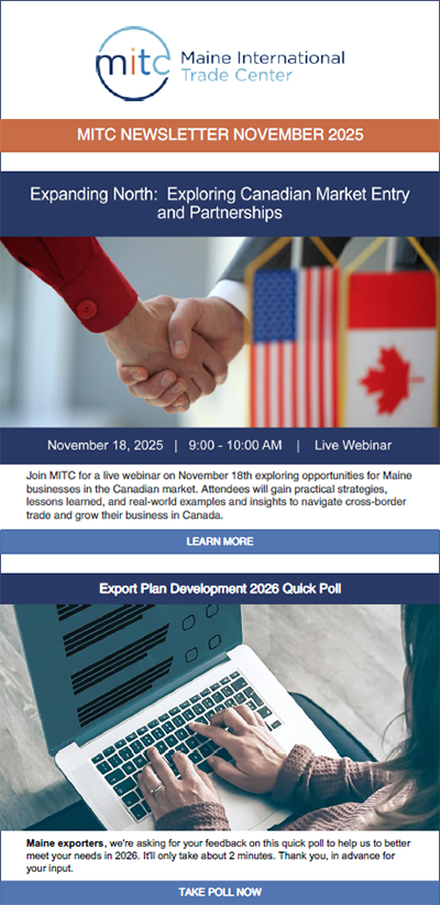 Newsletter Newsletter Maine International Trade Center distributes a monthly newsletter via email. Join Our Email List to receive the newsletter in your inbox, or use the links below to view PDF versions of recent issues. NOVEMBER 2025 OCTOBER 2025 SEPTEMBER 2025 AUGUST 2025 JULY 2025 JUNE 2025 MAY 2025 APRIL 2025 MARCH 2025 FEBRUARY 2025 JANUARY 2025